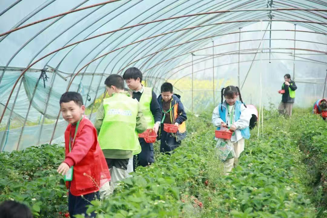 红彤彤的草莓藏在绿叶下,孩子们挎着小篮,弯腰采摘,不一会儿就装满一篮。“我要带回去给妈妈尝尝!”11岁的解夏被分在黄队,她小心翼翼地把草莓放进篮子,脸上满是笑意,“跟小伙伴们在一起,太开心了!在这里,真的感受到了春的信息。”